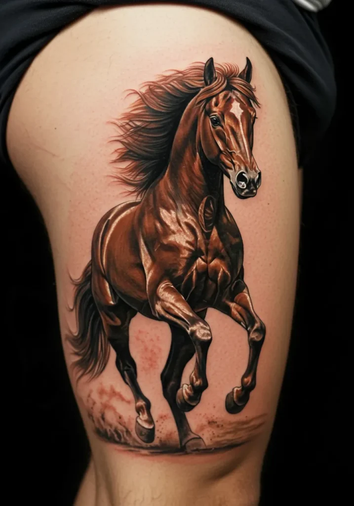 This tattoo is full-on horsepower literally. It features a majestic chestnut horse captured mid-gallop, muscles flexed and mane flowing wildly in the wind. The artist nailed every detail, from the reflection on the sleek coat to the dust kicking up around its hooves. It s all motion and strength, frozen in perfect form right on the upper thigh.