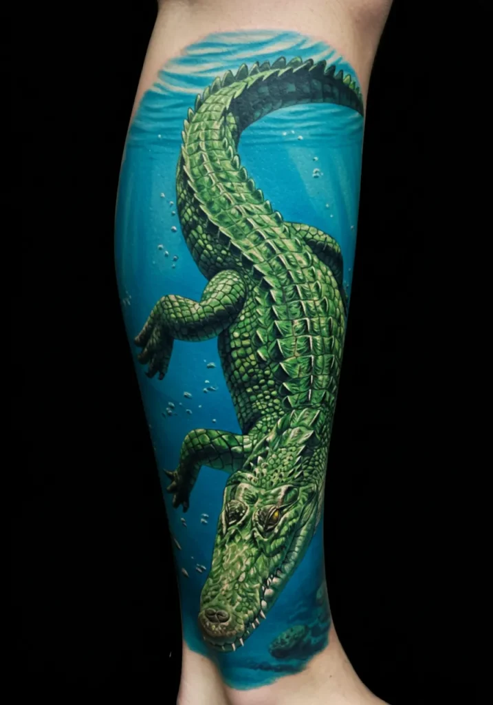 This crocodile tattoo is pure aquatic power. It wraps beautifully around the lower leg with a super detailed croc gliding underwater, surrounded by bright blue currents and floating bubbles. The scales pop with a rich, textured green, and the way the light hits its back makes it look like it s actually swimming just beneath the surface.