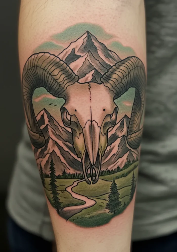 Ram Skull and Mountain Landscape Forearm Tattoo