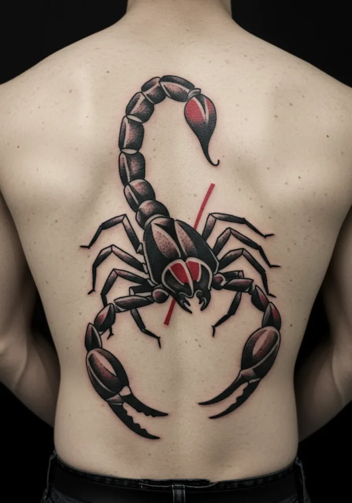 This scorpion tattoo is seriously fierce. Done in a bold neo traditional style, it stretches across the back with sharp lines, chunky black shading, and pops of deep red that bring it all to life. The tail curves perfectly up the spine, ending in that signature stinger ready to strike. There s also a red diagonal slash behind it that adds just the right touch of attitude and graphic flair.