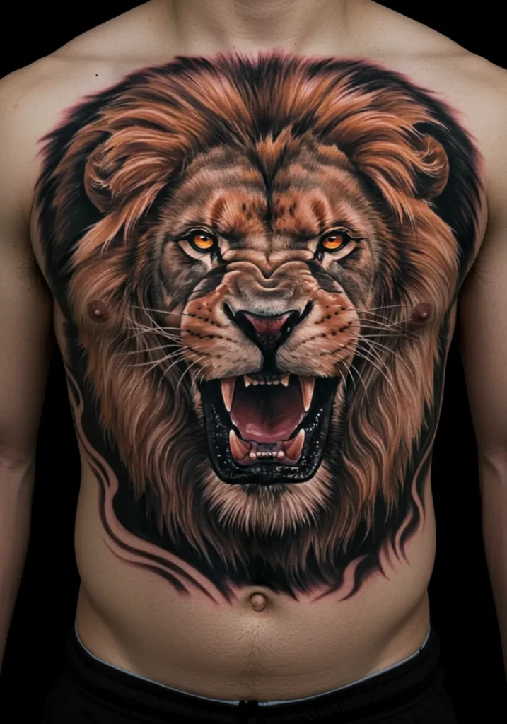 This lion tattoo is an absolute beast in the best possible way. It takes up the entire chest with the face of a roaring lion, and the detail is just insane. Every strand of the mane flows like fire, the fur texture is hyper-realistic, and those eyes? Wild and golden and locked in like you ve just crossed a line. The open mouth shows every fang in full drama, and the placement makes it feel like the roar is coming straight from the soul.