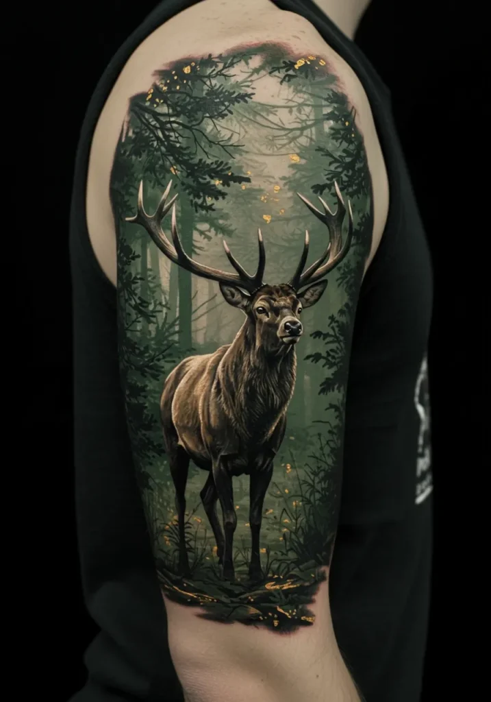 This tattoo captures a proud stag standing tall in the heart of a misty forest, and honestly, it s pure magic. The detailing is absolutely breathtaking from the texture in the fur to the lifelike look in the stag s eyes. Surrounding him is a lush, deep green woodland setting, with golden specks floating through the trees like little forest fireflies. It wraps beautifully around the upper arm, like you re carrying a slice of the wild right on your skin.