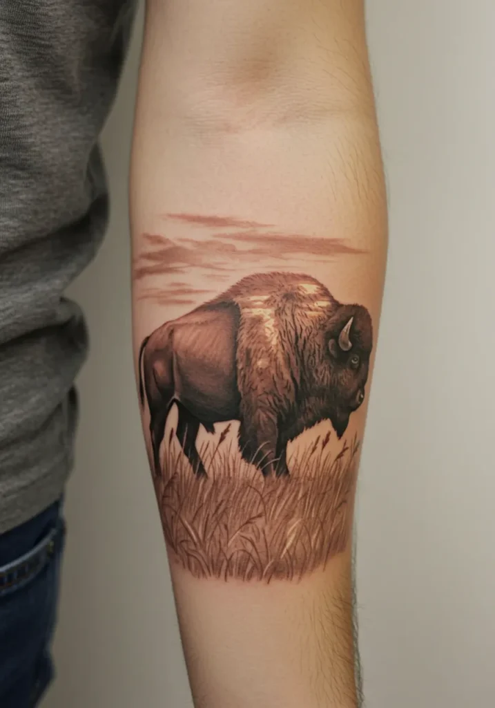 Bison in the Prairie Forearm Tattoo in Sepia Tones