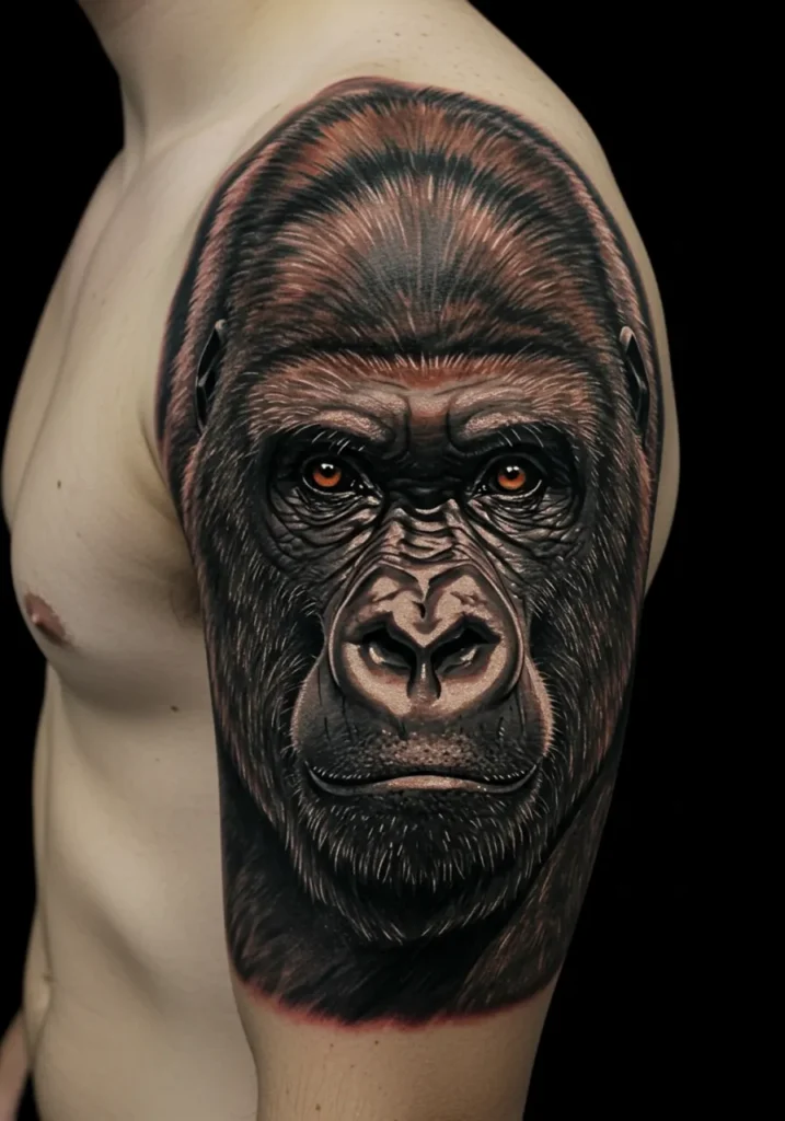 I honestly love how grounded this tattoo feels. It doesn t need any extra elements or flashy colors the gorilla s face says it all. There s this quiet power in the expression that just radiates strength and dignity. It s the kind of tattoo that speaks volumes without shouting, and I think that makes it even more impressive.