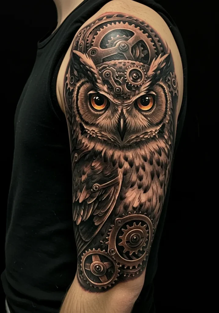 This owl tattoo is where steampunk meets wildlife and honestly, it s genius. The owl s face is mesmerizing with those fiery amber eyes, but the real twist is the mechanical gears embedded into its feathers and forehead. The entire piece looks like a perfectly engineered creature, with every cog and gear intricately placed and shaded to look hyper-real. The rich bronze and brown tones pull it all together like a well-oiled machine.