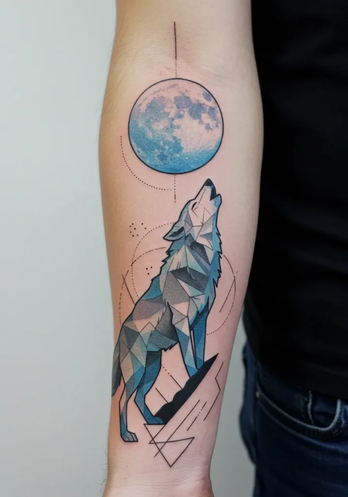 This tattoo takes a howling wolf and turns it into something totally futuristic and fresh. The design is made up of sharp geometric shapes in cool tones of blue and grey, almost like a crystal wolf under the stars. Above it sits a watercolor-style moon in soft shades of blue and pink, adding just the right dreamy touch. The whole thing is framed with dotted lines and abstract shapes that make it look almost like a cosmic blueprint.