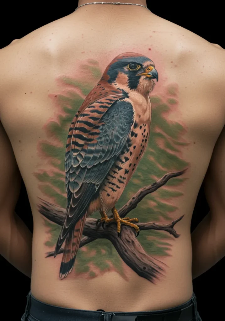 This tattoo showcases an absolutely stunning American kestrel perched proudly on a branch, stretched across the upper back like a living painting. The feathers are incredibly detailed with that signature mix of warm rust orange and steel blue. The soft forest green and dusty rose background brings a gentle blur that makes the bird stand out even more. You can almost feel the breeze rustling through the trees behind it.