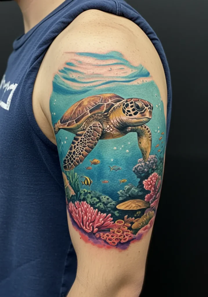 This tattoo is like a tropical vacation for your skin. A beautifully detailed sea turtle glides through a vibrant underwater scene filled with colorful coral, playful fish, and shimmering blue water. The upper part of the ocean fades softly into the skin tone near the shoulder, giving it a dreamy, almost weightless look. Every color is rich and punchy from the soft green shell to the hot pink coral below.