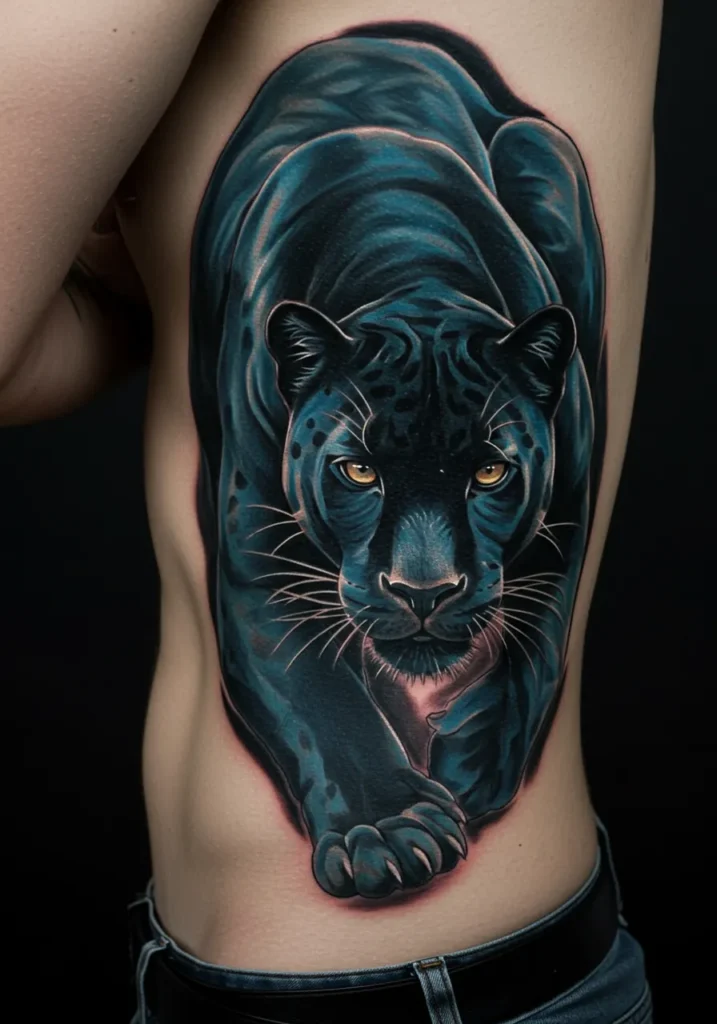 This panther tattoo is next-level fierce. It stretches across the ribcage with a prowling black panther staring straight ahead, totally locked in. What makes it pop are those cool blue tones woven into the fur, giving it this almost glowing, shadowy vibe. The detail around the eyes and whiskers is razor sharp, and the way the claws reach forward adds so much motion. It s sleek, muscular, and absolutely wild in the best way.