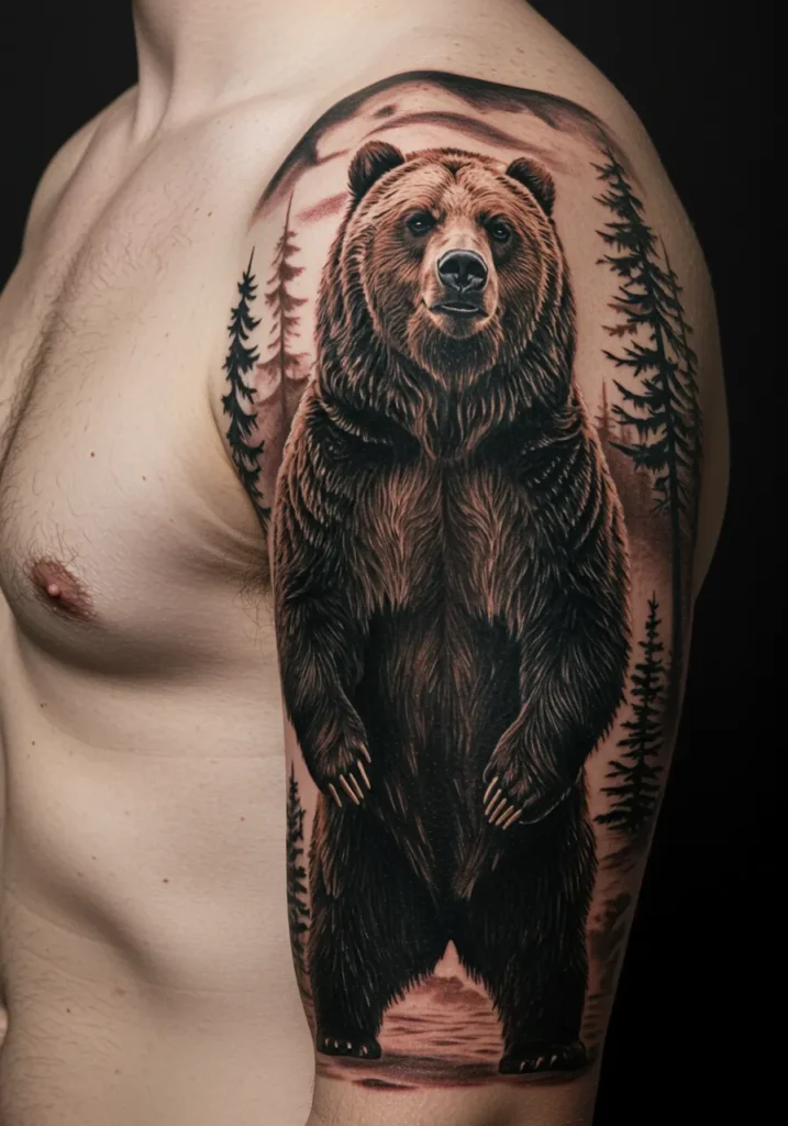 This tattoo features a mighty grizzly bear standing tall in the center of a pine forest, and it absolutely commands attention. The fur texture is crazy detailed, with rich brown tones that give the bear this deep, almost lifelike softness. The trees in the background are silhouetted just enough to frame the bear perfectly, giving the whole piece this grounded, majestic energy.