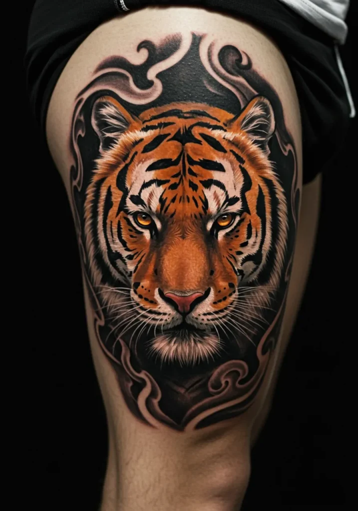 This tiger head tattoo is pure intensity from the very first glance. The face is ultra-realistic, with every hair in the fur and every stripe perfectly inked. The eyes? Sharp as blades and glowing with this golden fire that totally locks you in. What makes it even more dramatic is the ornamental black and grey smoke-like framing around the tiger, giving it a bold contrast and some serious wow factor on the thigh.
