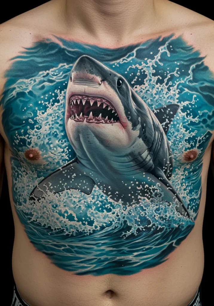 This tattoo is full-blown intensity. Front and center is a massive great white shark bursting out of churning ocean waves, jaws wide open and teeth on full display. The water is done in vivid blues and whites, swirling with movement and splashes that wrap perfectly across the chest. The shark s shading and muscle definition give it a wild 3D look like it s actually leaping off the skin.