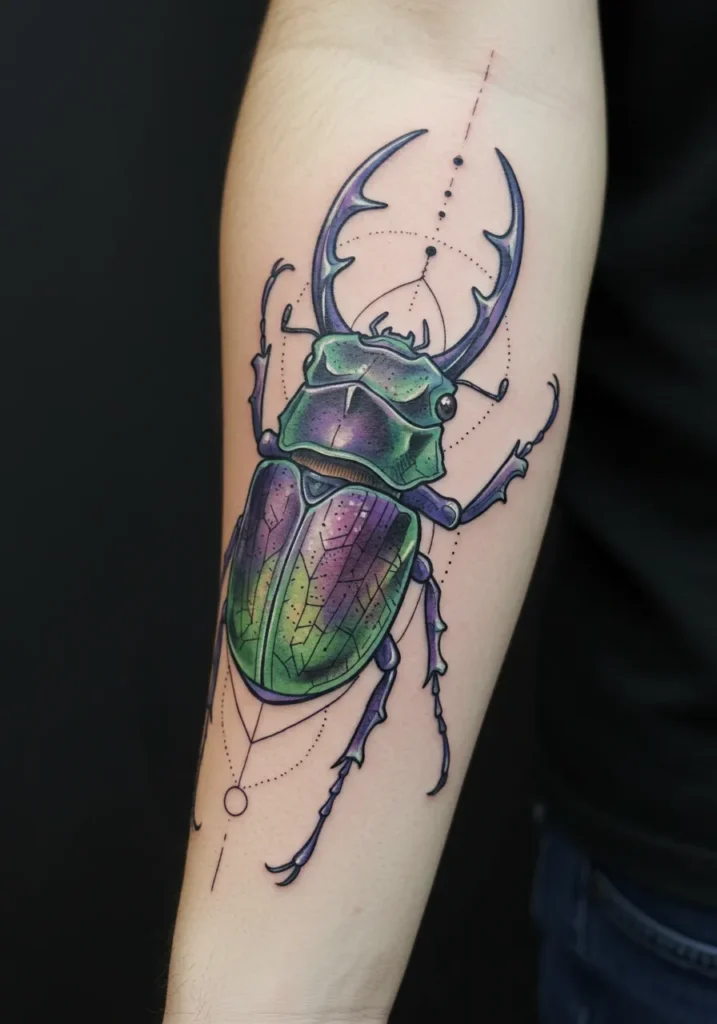 Geometric Stag Beetle Forearm Tattoo with Iridescent Colors