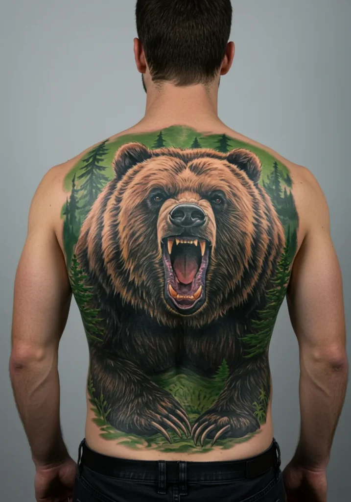 This tattoo is a total powerhouse. It features a massive grizzly bear mid-roar, jaws wide and fangs on full display, stretching across the entire back. The fur detailing is insanely realistic, and the deep browns are perfectly highlighted with just enough contrast to make the whole bear look alive. Surrounding the beast are tall green pine trees, giving it that wild forest vibe that ties everything together like a full nature scene.