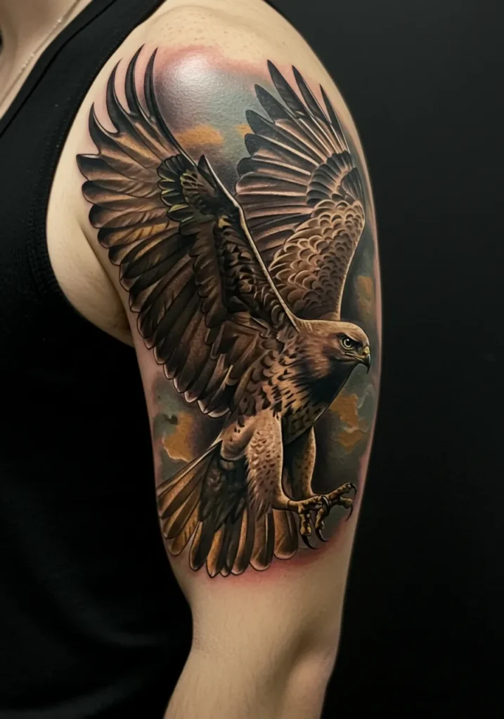 This hawk tattoo is pure action and elegance in one stunning piece. The wings are fully spread, catching every bit of motion mid-air, and the detailing on the feathers is so sharp it s honestly jaw-dropping. The earthy tones of browns and golds blend beautifully with a cloudy sky background, giving the whole design depth and atmosphere. The hawk s fierce expression and sharp talons add just the right edge.
