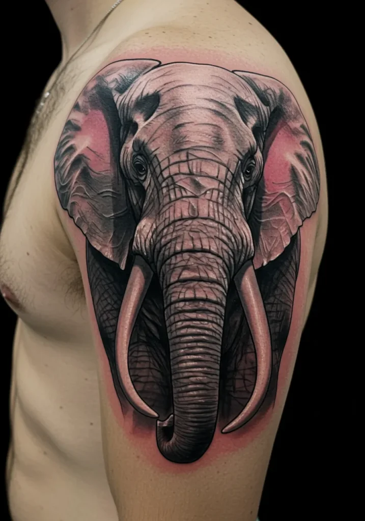 This elephant tattoo is a showstopper. Centered perfectly on the upper arm, it features a strikingly realistic elephant head with massive tusks and deeply textured skin. The shading is gorgeous soft enough to highlight every wrinkle but bold enough to give it serious depth. The subtle reddish-pink glow in the background adds just the right contrast, making the entire piece pop without being overpowering.
