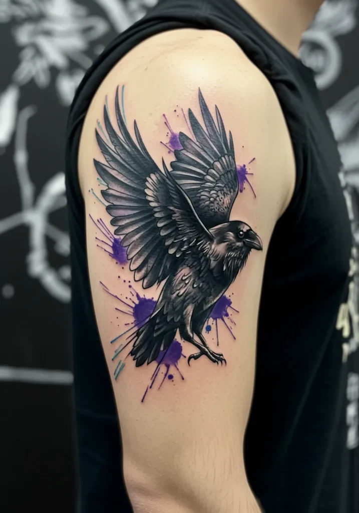 Flying Raven Tattoo with Purple Watercolor Splashes