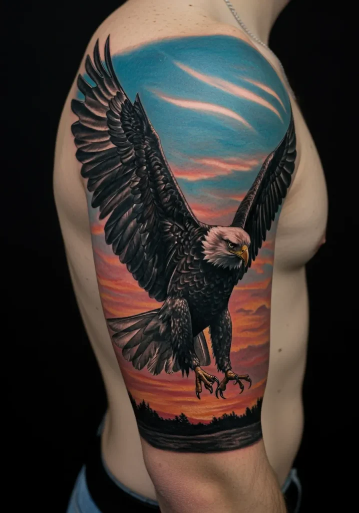 Bald Eagle Shoulder Tattoo with Sunset Sky