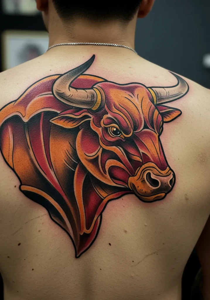 This bold bull tattoo roars with power and personality right across the upper back. The neo traditional style brings a gorgeous balance of clean lines and saturated colors, blending deep reds, oranges, and hints of yellow for that fiery vibe. The shading gives the bull s muscles this sculpted, almost metallic look, and those curved horns mean business. It s centered perfectly between the shoulders, making it a true showpiece from every angle.