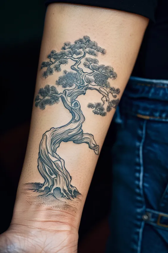 A beautifully detailed bonsai tree stretches across the forearm, its twisted trunk and delicate branches creating a sense of quiet strength. The fine linework captures every intricate texture, from the gnarled bark to the soft, wispy pine needles. Shading adds depth, making the tree appear rooted in both nature and tradition.