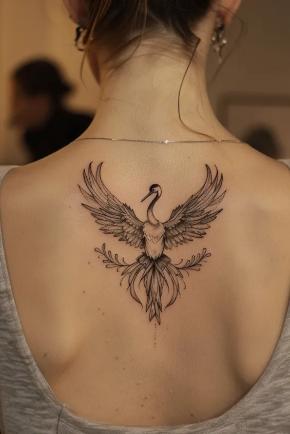 A delicate Japanese crane spreads its wings in perfect symmetry, creating an elegant focal point on the upper back. The fine linework highlights every feather with precision, while the flowing tail feathers add a soft, ethereal touch. Gentle ornamental details frame the design, giving it a beautifully balanced and refined appearance.