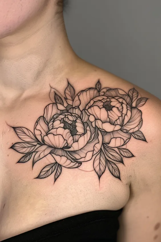 Two beautifully detailed peonies bloom across the collarbone, with fine linework and soft shading giving them a delicate yet sophisticated look. The petals unfold gracefully, and the leaves add a balanced flow to the design, making it feel natural and effortlessly feminine. The black and grey palette enhances the elegance, allowing the details to shine without overpowering the skin.