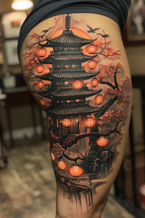 Enchanting Pagoda and Lanterns Thigh Tattoo