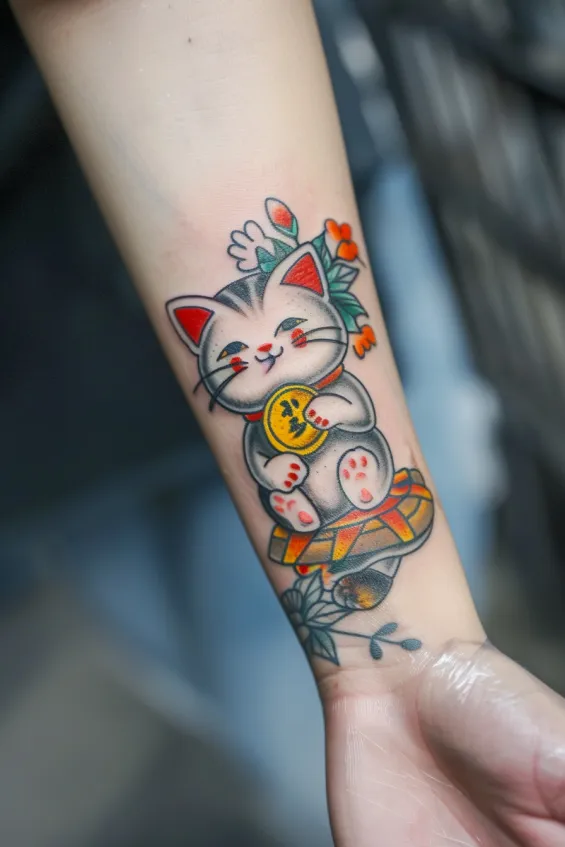 A cheerful maneki-neko, or lucky cat, sits happily with its signature raised paw, holding a golden coin symbolizing prosperity. The vibrant mix of soft greys, warm oranges, and bold black outlines gives this tattoo a charming, classic Japanese look. Tiny floral details and a patterned cushion add extra personality, making the design feel lively and full of positive energy.