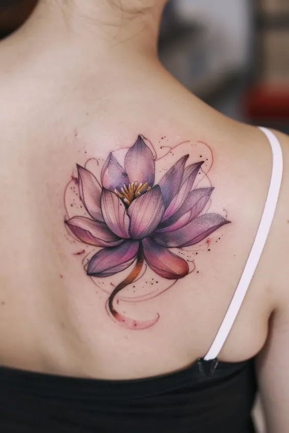 A breathtaking lotus flower blossoms across the upper back, its petals painted in soft shades of purple and pink with a dreamy watercolor effect. Delicate shading and tiny ink splashes add a touch of artistic whimsy, making the design feel both organic and ethereal. The golden center draws the eye, creating a beautiful contrast against the cooler tones of the petals.