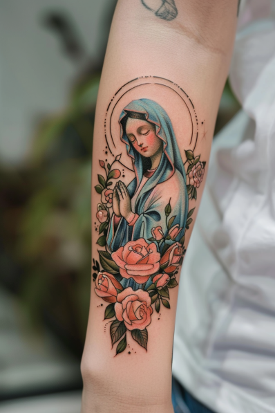 Virgin Mary Surrounded by Roses Tattoo
