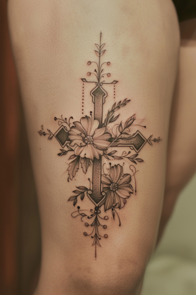 This thigh tattoo features an ornate cross adorned with beautifully shaded flowers and intricate vines. The blend of geometric shapes in the cross contrasts elegantly with the soft petals, giving the design a balanced and harmonious feel. Fine dotwork and subtle line accents enhance the floral elements, creating a tattoo that feels both feminine and powerful. The vertical flow of the vines makes it a perfect fit for the thigh, drawing the eye naturally along its length.
