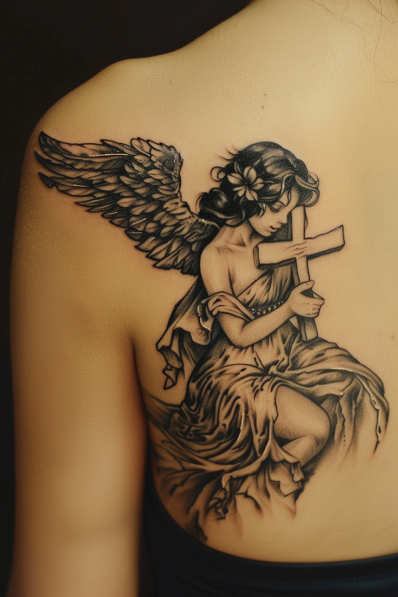 Guardian Angel Embracing a Cross Tattoo
