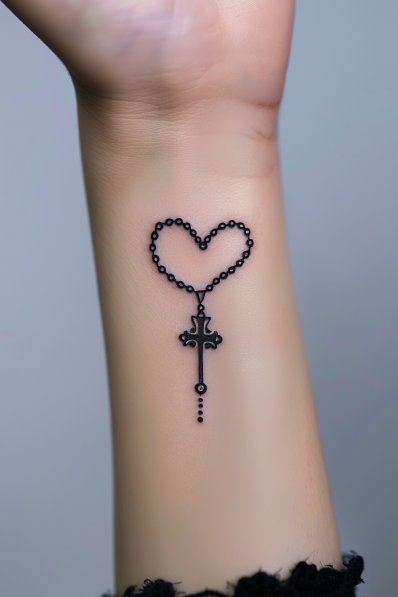 This small wrist tattoo combines simplicity with deep symbolism. The rosary beads are cleverly shaped into a heart, with the cross delicately hanging below, creating a design that feels both modern and timeless. The clean black linework keeps it subtle yet striking, making it a perfect piece for someone who values understated elegance. The compact size and placement add to its charm, making it an intimate and personal expression of faith.
