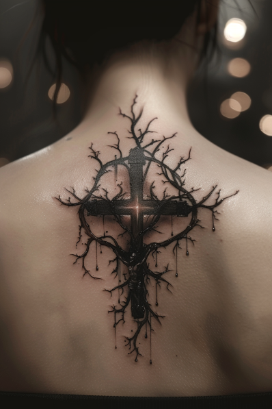 This dramatic back tattoo features a bold cross intertwined with torn and jagged branches, creating a raw and emotional design. The branches appear fragmented, as though weathered by time, with dripping elements that add a sense of fragility and depth. At the center of the cross, a glowing light breaks through, symbolizing hope and resilience in the midst of struggle. The overall design feels dark yet profoundly meaningful, blending faith with the beauty of imperfection.