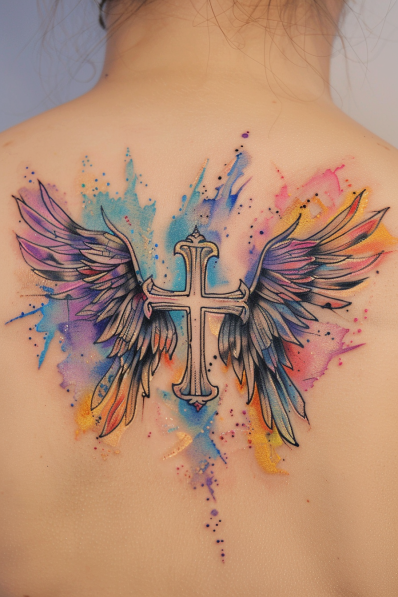 This vibrant back tattoo showcases a beautifully detailed cross with angelic wings, soaring against an explosion of watercolor hues. The wings spread gracefully, blending soft purples, blues, and oranges, while the metallic silver cross in the center anchors the design with a classic, spiritual touch. The watercolor splash effect adds a playful, modern twist, making the whole piece feel dynamic and alive.