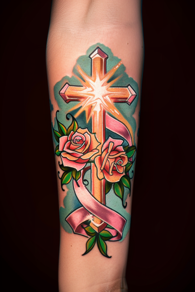 This bold forearm tattoo showcases a luminous cross glowing with a starburst effect, surrounded by vibrant pink roses and a flowing ribbon. The cross stands out with its golden tones and dynamic highlights, while the roses bring a touch of softness and romance. The ribbon, delicately wrapping around the design, adds movement and provides a subtle hint of personalization. The rich teal background makes the entire piece pop, giving it a stunning, three-dimensional quality.