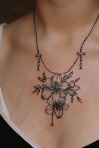 This chest tattoo is a beautiful fusion of faith and femininity, designed to mimic the look of a rosary necklace. The delicate chain wraps naturally around the collarbone, with two small crosses hanging on either side for balance. At the center, a bouquet of detailed lilies adds a soft, graceful touch, symbolizing purity and devotion. The black-and-gray shading gives the piece depth, making the flowers and crosses pop without overpowering the overall design.