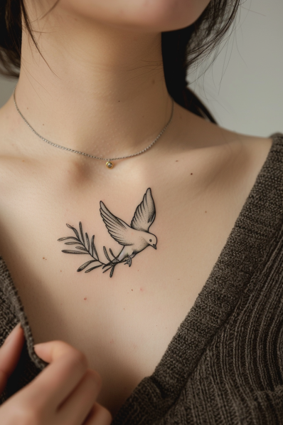 This delicate chest tattoo features a minimalist dove carrying an olive branch, symbolizing peace and the Holy Spirit. The simple black linework keeps the design clean and elegant, while the subtle details in the wings and branch add just the right amount of texture. Positioned right below the collarbone, this tattoo has a graceful and understated charm that s perfect for expressing faith in a subtle yet meaningful way.