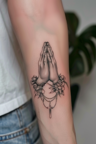 This forearm tattoo showcases the timeless image of praying hands, delicately wrapped in a rosary adorned with a small cross. Surrounding the hands are soft floral accents, blending faith and femininity in a truly elegant way. The shading on the hands gives them a realistic and gentle appearance, while the flowers add a touch of natural beauty. The flowing rosary beads tie the elements together, creating a design that feels balanced and serene.