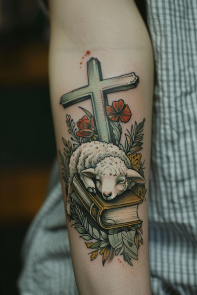Lamb with Cross and Bible Tattoo