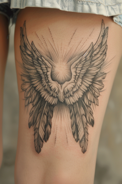 This thigh tattoo features a pair of intricately detailed angel wings spreading wide, framing a radiant burst of divine light at their center. The wings are crafted with expert shading that highlights each feather, giving the design a lifelike and majestic feel. The rays of light emanating from the middle add an ethereal quality, as if the wings are powered by a heavenly presence. This piece exudes grace and strength, making it a powerful statement of faith and protection.