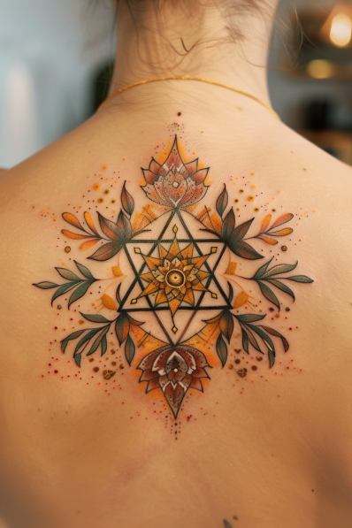 This breathtaking back tattoo blends sacred geometry with natural elements to create a spiritual and harmonious design. At the center, an intricate Star of David is surrounded by symmetrical olive branches, symbolizing peace and divine connection. The warm orange and gold hues radiate from the center like a glowing halo, while the soft green tones of the leaves add an earthy balance. Delicate dotwork and subtle shading tie it all together, making this tattoo both mesmerizing and meaningful.