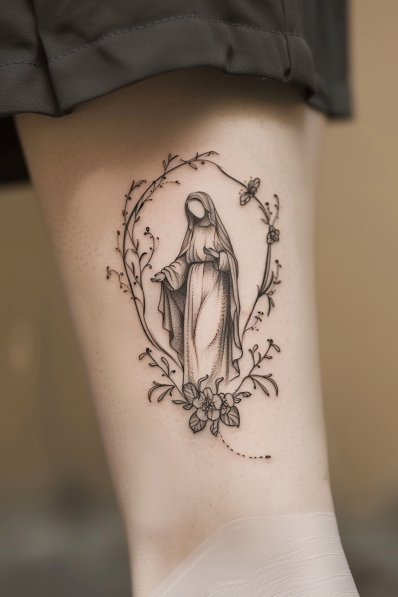 This leg tattoo captures the Virgin Mary in a humble and serene pose, surrounded by a delicate botanical frame. The fine linework brings out the gentle details of her flowing robes and peaceful demeanor. Small leaves, flowers, and a butterfly are woven into the oval frame, adding a touch of nature s beauty and emphasizing her connection to grace and purity. The design s subtle shading gives it a soft, ethereal quality.