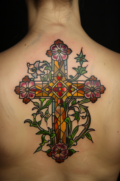 This striking back tattoo brings the beauty of a stained glass window to life on the skin. The vibrant cross is adorned with intricate floral patterns, featuring blooming lilies and other delicate blossoms in shades of pink, green, and gold. The bold black outlines give it a traditional stained glass effect, while the colorful panels inside the cross glow with a warm, sacred radiance. Twisting vines around the base add a touch of nature, grounding the design in elegance.