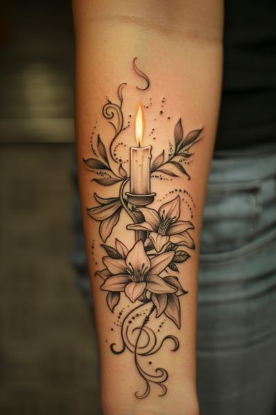 Candle and Lilies Tattoo with Spiritual Glow