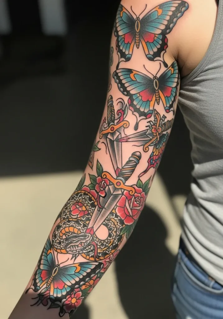 This full sleeve mixes softness and edge in the most beautiful way. Large, vivid butterflies in teal, orange, and coral shades float across the arm, while silver daggers pierce through red roses and a coiled snake. The layout flows perfectly from shoulder to wrist, with each detail outlined in bold black lines that give it that unmistakable American Traditional charm. The balance between bright wings and sharp steel is simply mesmerizing.