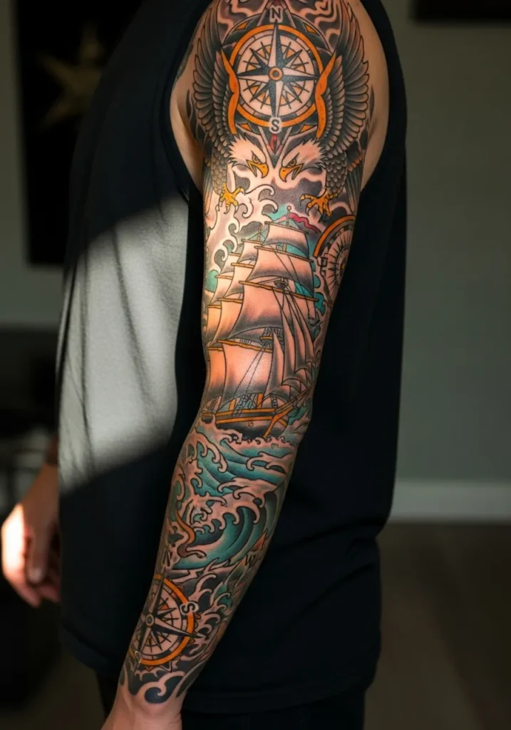 This sleeve captures the spirit of the open sea with incredible storytelling. A majestic ship sails through choppy teal waves while a bold eagle spreads its wings above a golden compass. The orange and blue tones contrast beautifully, and the smooth transitions between elements make it look seamless across the arm. Every detail, from the ship s sails to the compass points, has that unmistakable old-school boldness.