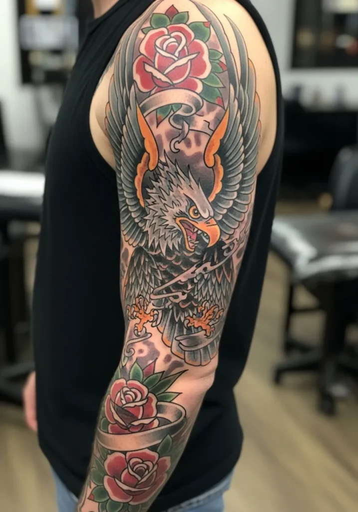 This bold sleeve features a fierce eagle with spread wings, framed by rich red roses and soft gray clouds. The golden beak and orange accents bring warmth, while the crisp outlines and balanced placement make it feel like a true American Traditional masterpiece. The mix of florals and strength is perfectly executed.
