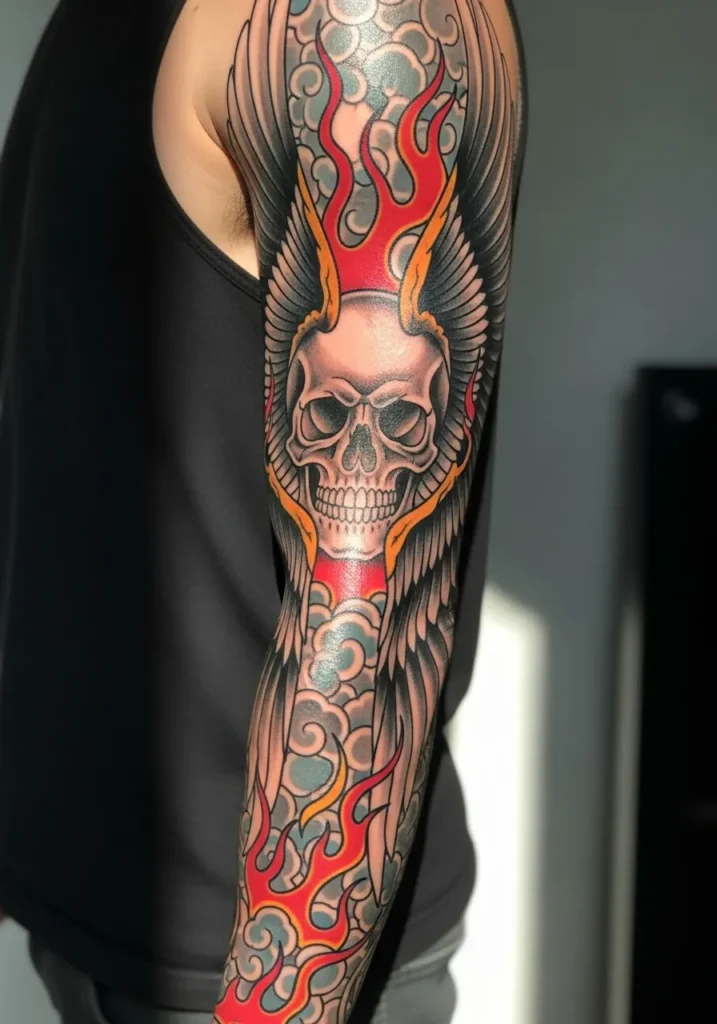 This sleeve design is pure intensity from top to bottom. A flaming skull with outstretched wings takes center stage, surrounded by curling smoke and rich red-orange flames. The detailed linework gives it structure, while the muted grays and bright colors keep that old-school energy alive. The design flows seamlessly down the arm, making it feel like a complete story rather than a collection of elements.