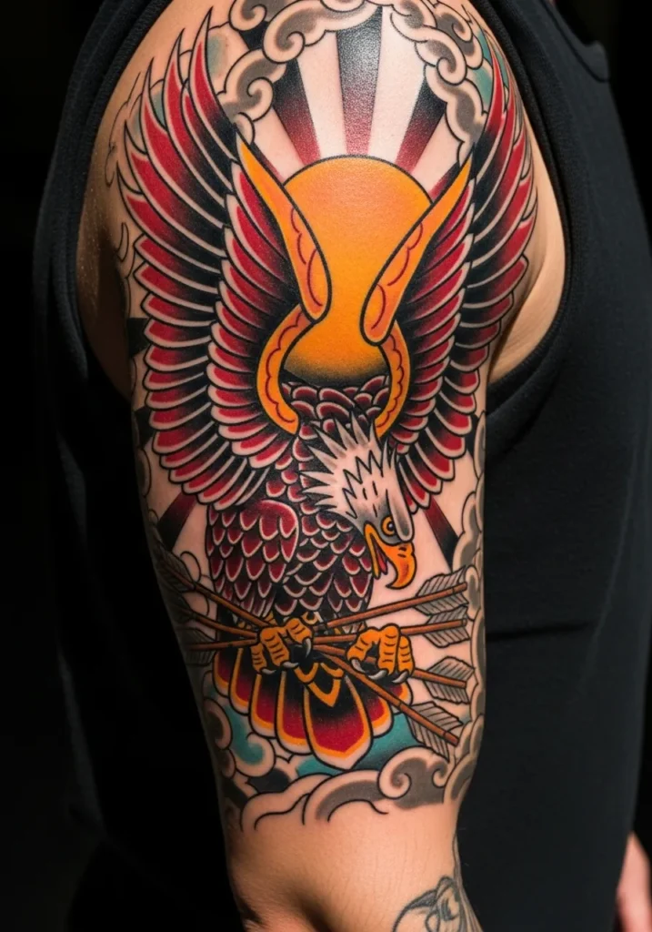 A majestic eagle spreads its wings in this upper arm tattoo, holding crossed arrows and flying beneath a radiant sunburst. The deep reds and burnt oranges give it warmth, while the strong black outlines anchor it in traditional style. The placement hugs the shoulder and bicep perfectly, emphasizing motion and pride.